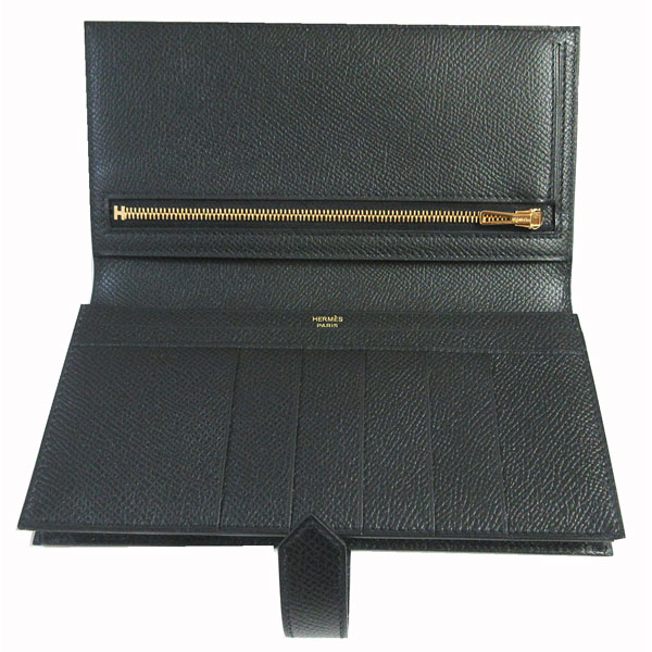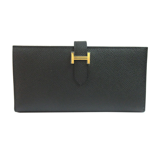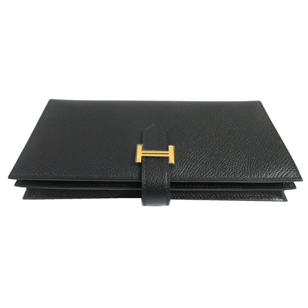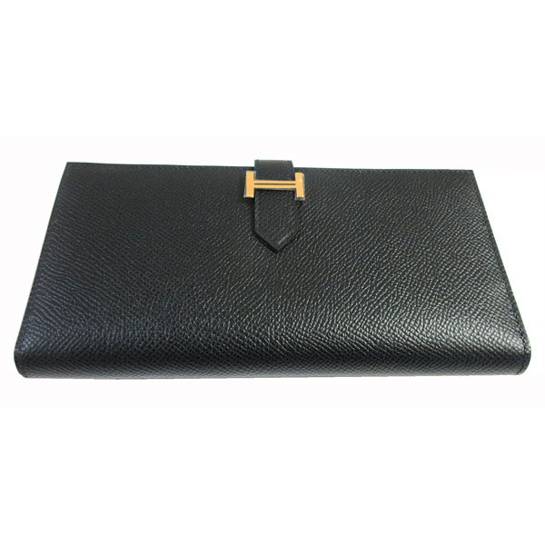 新品。箱・リボンでのラッピング。HERMES人気のベアンスフレは上品で素敵♪大人っぽいブラック×ゴールド金具。お札がたっぷり収容できるスフレタイプです。