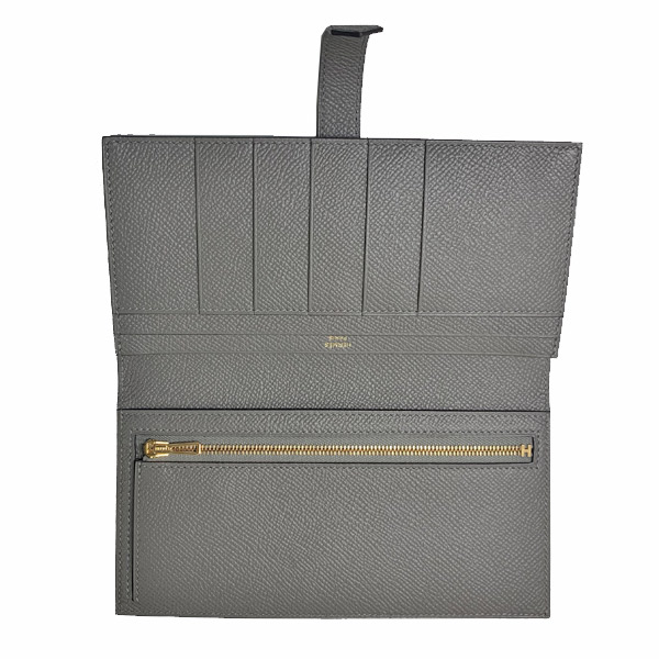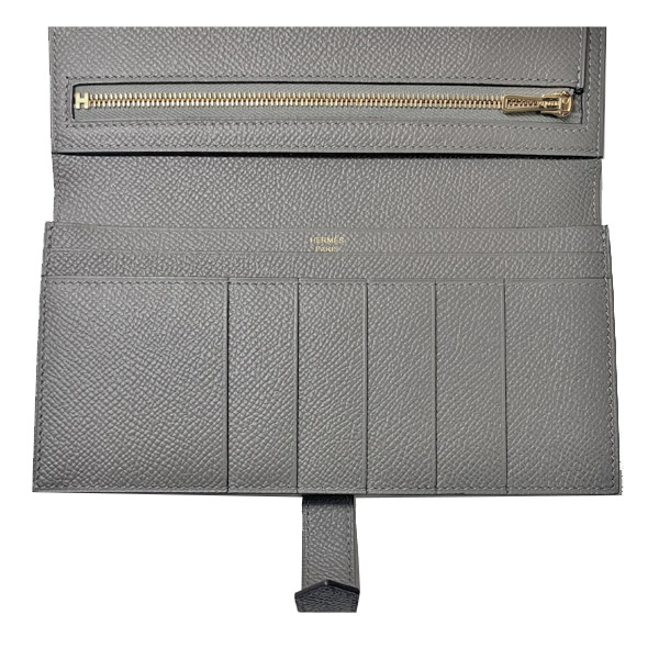 新品。エルメスの箱リボンでのラッピングです。エルメスの代表的なお財布のベアンスフレは上品で素敵♪落ち着いたグレーが美しい新色グリメイヤー 。お札がたっぷり収容できるスフレタイプです。