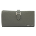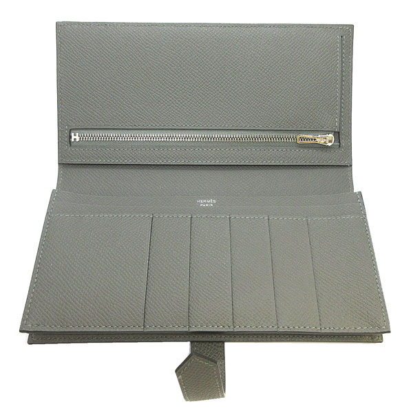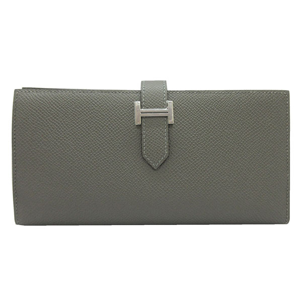 新品。エルメスの箱リボンでのラッピングです。エルメスの代表的なお財布のベアンスフレは上品で素敵♪落ち着いたグレーが美しい新色グリメイヤー 。お札がたっぷり収容できるスフレタイプです。