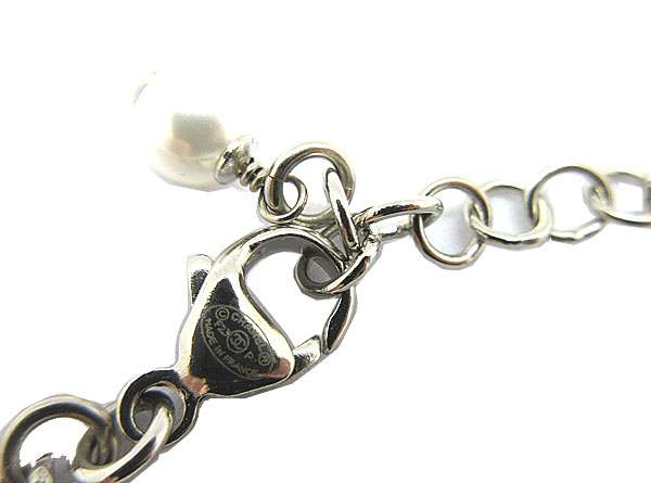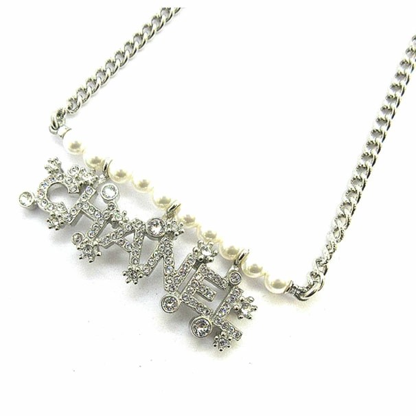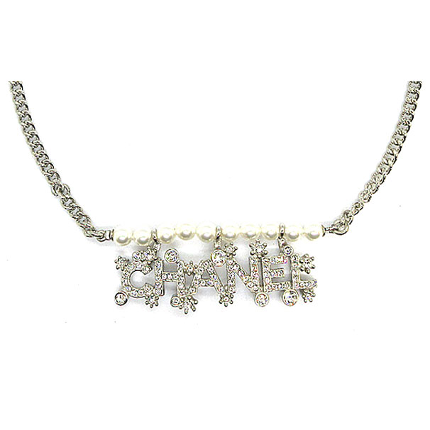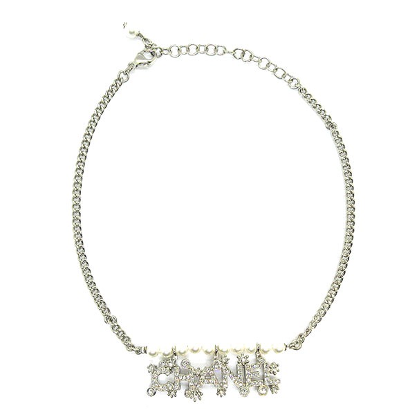 シャネルらしいCHANELシグネチャープレートにラインストーンが施されたデザインにパールとシルバーチェーンが魅力的なチョーカーネックレス。チェーンの長さは調節可能です。
