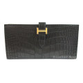 HERMES最高級の素材のべアンのクロコはやはり素敵♪エルメス人気の「ブラック×ゴールド金具」が高貴な印象。男性女性問わずお使い頂けます。お札がたっぷり収容できるスフレタイプです。2023年製造B刻印です。